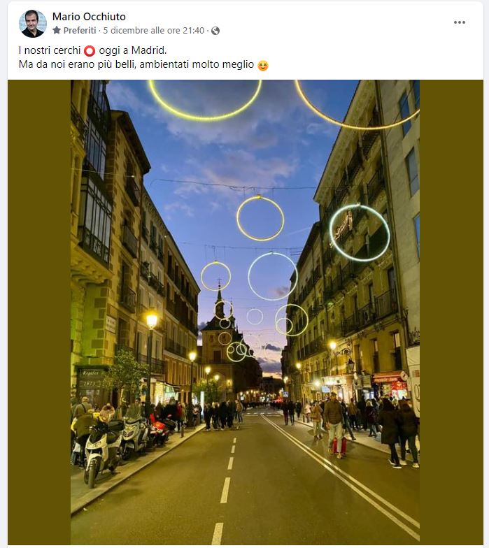 3 minuti per la letturaCOSENZA – L’ex sindaco Mario Occhiuto sospira davanti a una foto scattata a Madrid, nei giorni scorsi, che ritrae una via della capitale spagnola adornate da cerchi luminosi e colorati per il Natale. «I nostri cerchi oggi a Madrid. Ma da noi erano più belli, ambientati molto meglio», scrive su Facebook, con emoji sorridente. E nei commenti qualche nostalgico fa capolino.