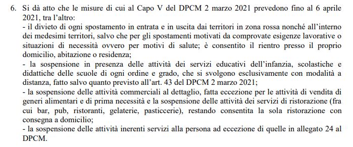 Le polemiche sono state originate dal passaggio dell’ordinanza regionale pubblicata ieri in cui si legge: «Si dà atto che le misure di cui al Capo V del Dpcm 2 marzo 2021 prevedono fino al 6 aprile 2021, tra l’altro […] la sospensione delle attività dei servizi di ristorazione (fra cui bar, pub, ristoranti, gelaterie, pasticcerie), restando consentita la sola ristorazione con consegna a domicilio».