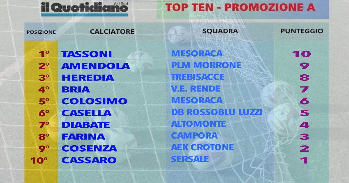 Già, perché la Top Ten Promozione A tiene in considerazione proprio questo, ossia il rendimento avuto nel corso delle giornate. Per cui ogni settimana andremo a premiare i migliori del torneo, con un punteggio a scalare da dieci a uno. I punti ottenuti andranno così a sommarsi per comporre la classifica generale. Faremo questo per tutti e tre i principali tornei dilettantistici calabresi, vale a dire Eccellenza, Promozione A e B.