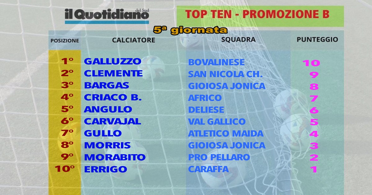 Di nuovo presenti nella Top Ten di Promozione B i centravanti Angulo della Deliese e Carvajal del Val Gallico. Entrambi il timbro lo stanno lasciando in ogni gara, dimostrandosi micidiali sotto porta. Ma prima di loro, riecco Bruno Criaco dell’Africo, motorino inesauribile, dinamico e di carattere. Da parte sua un’altra prestazione di un certo peso. Accanto a queste tre conferme ecco quattro novità, rappresentate da Gullo dell’Atletico Maida (anche lui si sta ritagliando un ruolo da protagonista), Morris del Gioiosa Jonica (fra i migliori in campo). E poi: Morabito della Pro Pellaro (quantità e qualità, con due reti decisive) e Errigo del Caraffa (il capitano cerca di mettere ordine in mediana e la sua squadra ferma la capolista).