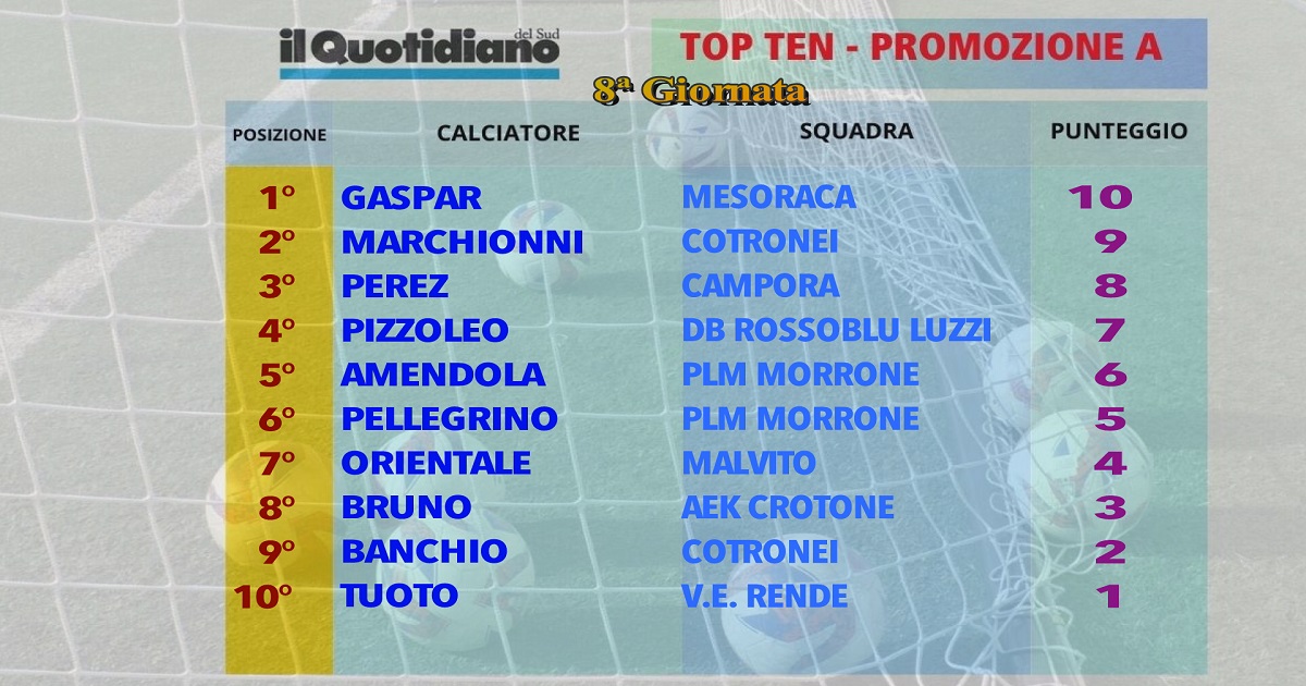 La graduatoria dei migliori registra una new entry e un ritorno nella Top Ten di Promozione A, giornata numero 8. Alle spalle di Gaspar troviamo infatti Valentin Marchionni, classe 2005, fra i più bravi in questo felice avvio di campionato del Cotronei. Subito dietro c’è Perez, dinamico calciatore del Campora, nuovamente a segno e puntualmente in grado di fare la differenza. Fra l’altro proprio al Campora appartiene il vincitore della Top Ten della settima giornata (il portiere Vjiande).