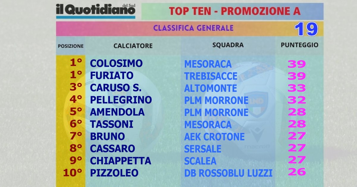 La Calabria dei Dilettanti saluta Davide Cassaro come autentico evergreen e leader di una Top Ten nella quale il podio è completato da due portieri. Nella giornata numero 19 premiamo innanzitutto Patitucci del Trebisacce. Efficace il portiere della capolista e attento fra i pali. C’è quindi l’esperienza di Nunzio Franza al terzo posto. Il portiere dell’Altomonte non ha ancora subito reti nel girone di ritorno e al solito regala affidabilità al reparto. Scorrendo la Top Ten dei migliori di giornata, ecco Lorecchio del Mesoraca, all’ennesimo campionato da protagonista. Corre per due e offre sempre un rendimento elevato. Ritorna nella classifica dei migliori il difensore Orientale del Malvito. Un gigante difficile da superare. Ennesima presenza per Colosimo del Mesoraca. D’altronde segna con una regolarità disarmante. Nella DB Rossoblù Luzzi che torna a vincere, una menzione la merita D’Acri. Il capitano è poco reclamizzato, ma molto redditizio. Costante e dinamico, come pochi. Infine ci sono le conferme di De Arriba del Cassano, Vijande del Campora e Bertini dell’Altomonte. Tre elementi di grande affidabilità.