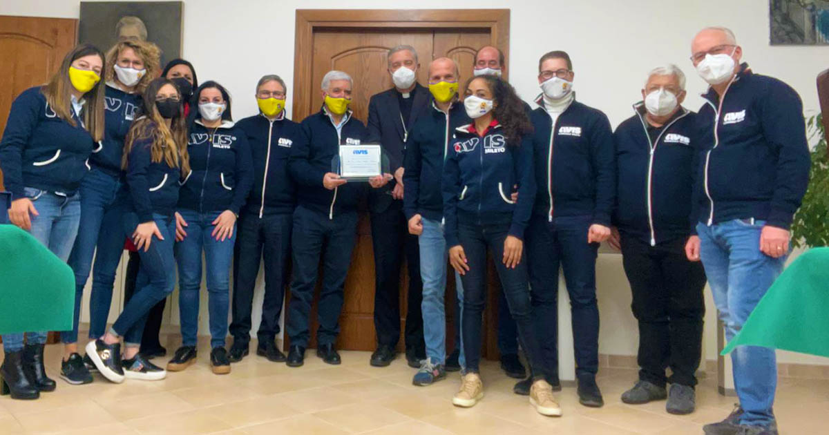 Il vescovo di Mileto-Nicotera-Tropea Attilio Nostro davanti l\'ingresso della chiesa del Cuore Immacolato di Maria Rifugio delle Anime