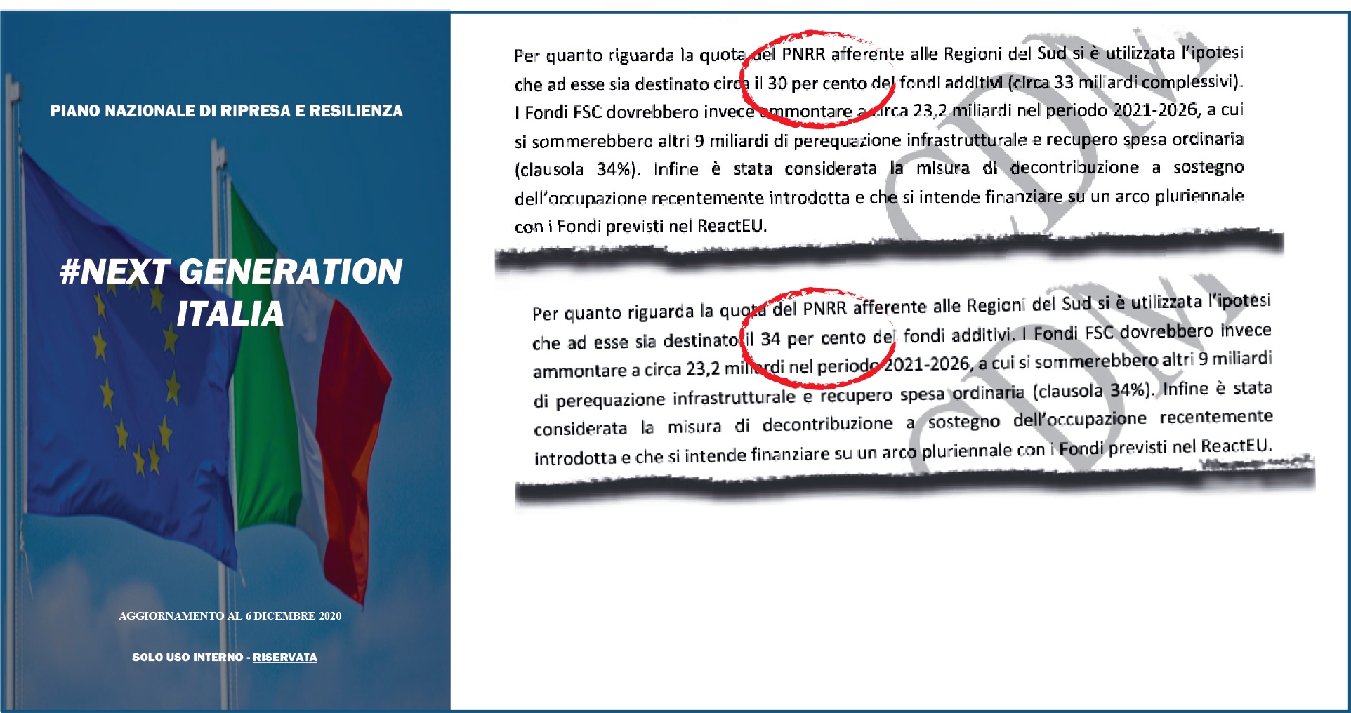 E infatti nella prima versione del capitolo sulla “Valutazione d’impatto delle misure per il Sud nel Pnrr e nel Ddl di Bilancio” si destina” al Sud una quota di risorse per Recovery Plan pari al 30% – “circa il 30 per cento dei fondi additivi (circa 33 miliardi complessivi), vi si legge – che nella seconda, dopo un evidente braccio di ferro al tavolo dei ministri, passano al 34%.
