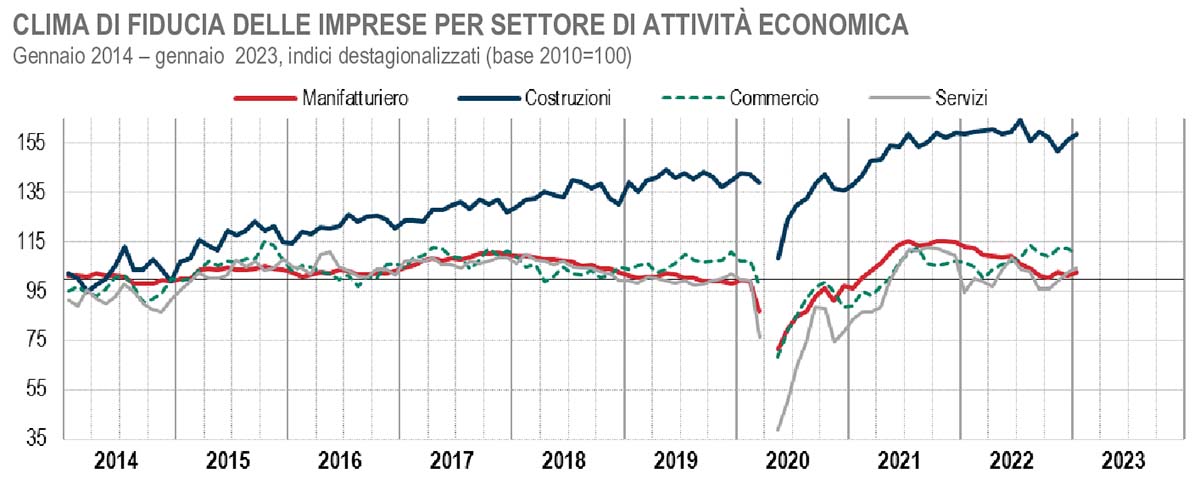 In ogni caso il livello raggiunto supera la media del periodo gennaio-dicembre 2022. Scomponendo l’andamento nei vari comparti emergono segni più per giudizi sulle scorte (ma non sugli ordini) e sulle attese di produzione per l’industria manifatturiera, rialzi per i giudizi sulle scorte e sulle attese di produzione per quanto riguarda i beni di consumo e stesso trend per quelli intermedi (col dato negativo, però, sugli ordini). Tutti segni più, infine, per i beni strumentali, le costruzioni, trasporto e magazzinaggio, servizi turistici, informazione e comunicazione, servizi alle imprese. Commercio con numeri particolarmente alti per la grande distribuzione (+41,5 i giudizi sulle vendite). In questo comparto sono in calate solo le attese sulle vendite.